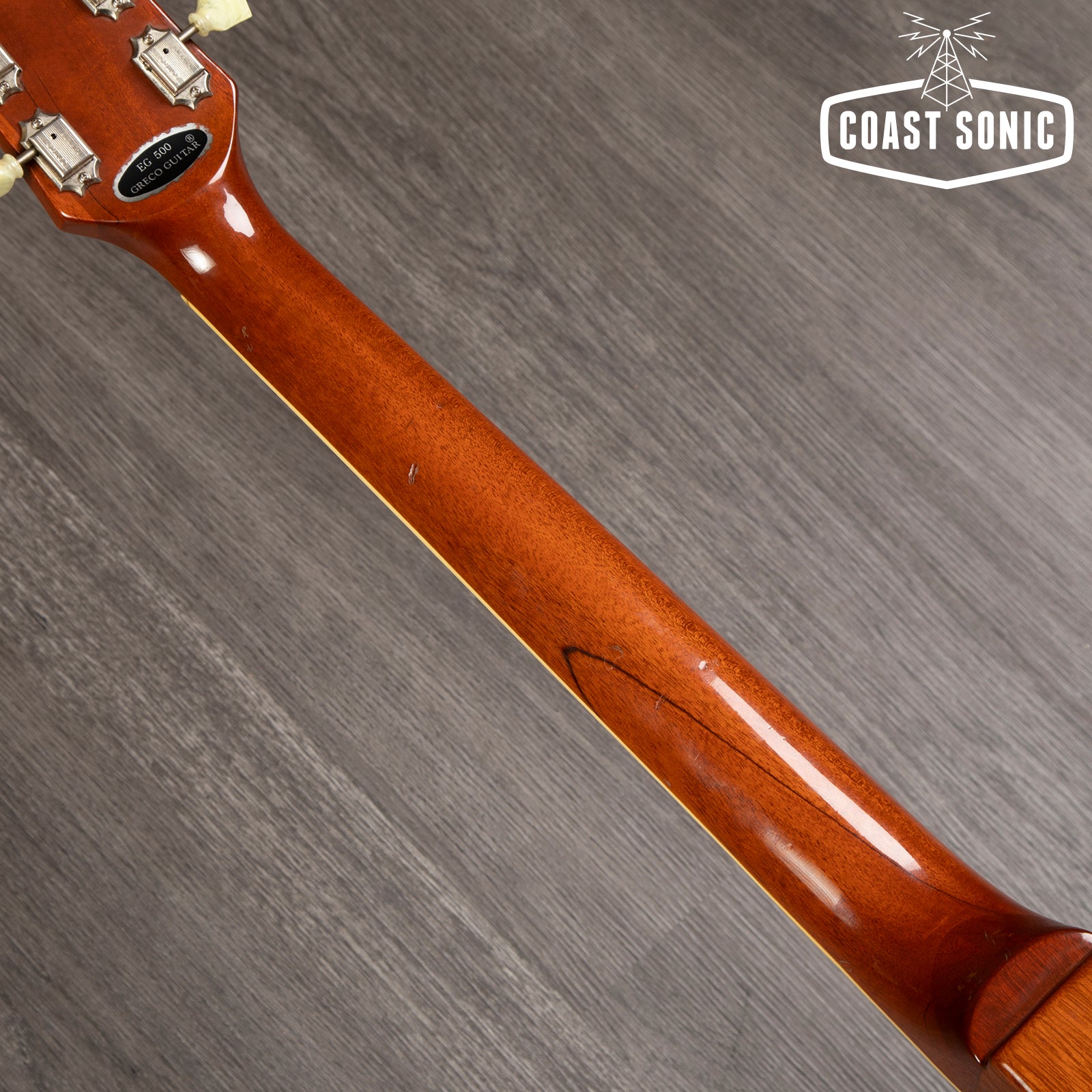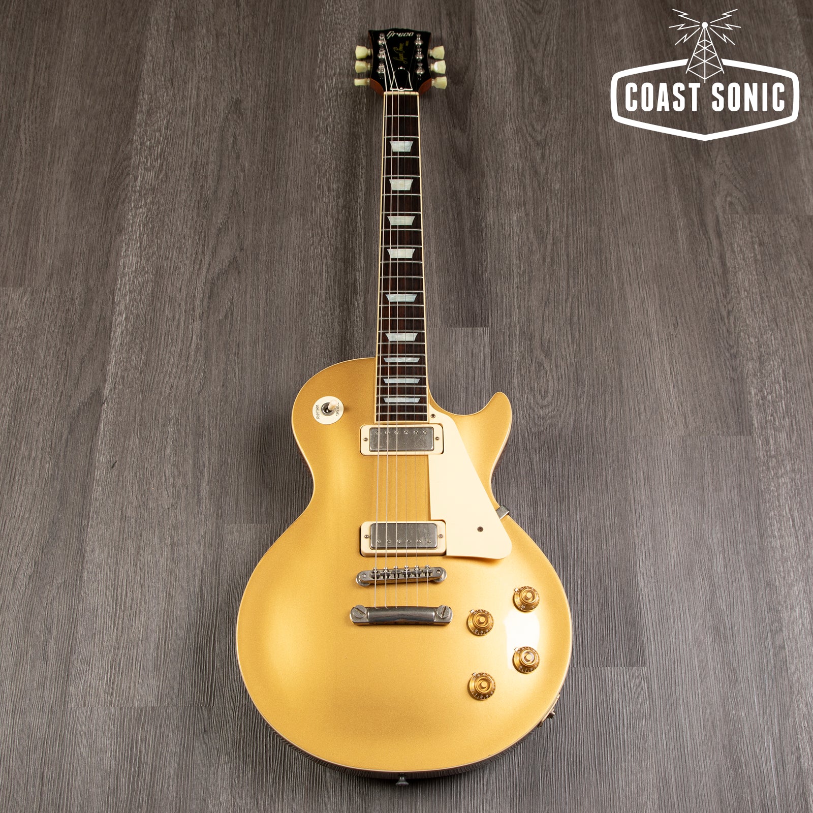 A rare 1980 Greco EG500GS Super Power goldtop with mini humbuckers. Made in Japan at the legendary Fujigen factory in the golden era of Japanese craftsmanship. These are a pretty dead-on copy of a late 70's Les Paul deluxe so it has a non-pancake mahogany body and mahogany neck and the larger 70's headstock. Basically a 70's deluxe but built better than the actual 70's Gibson's - hence the "lawsuit era" association.