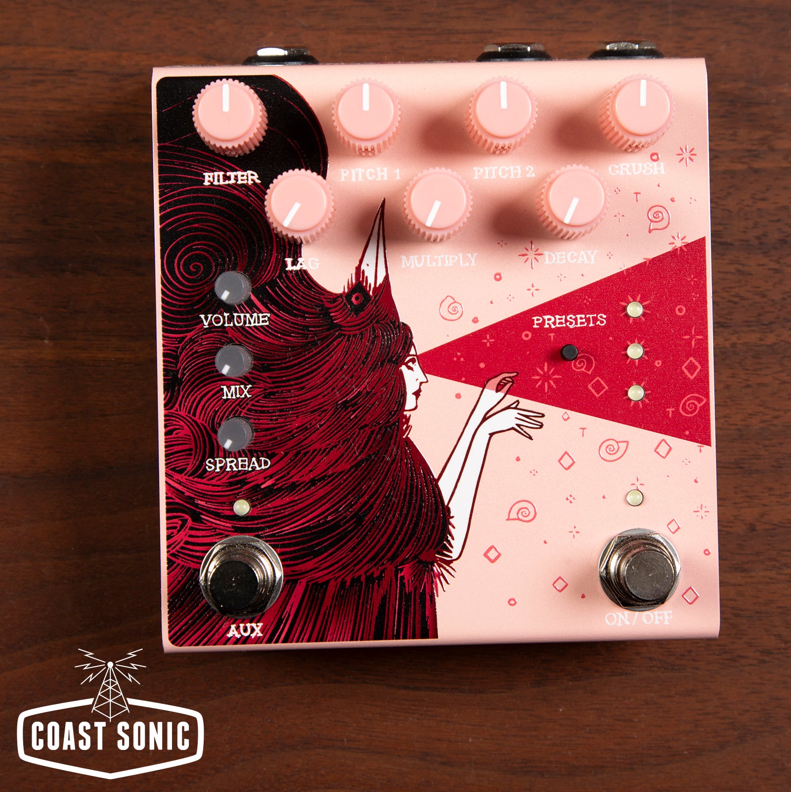 Aux switch to indefinitely sustain trails, close the low pass filter, or set the pitches to +1 octave, depending on setting