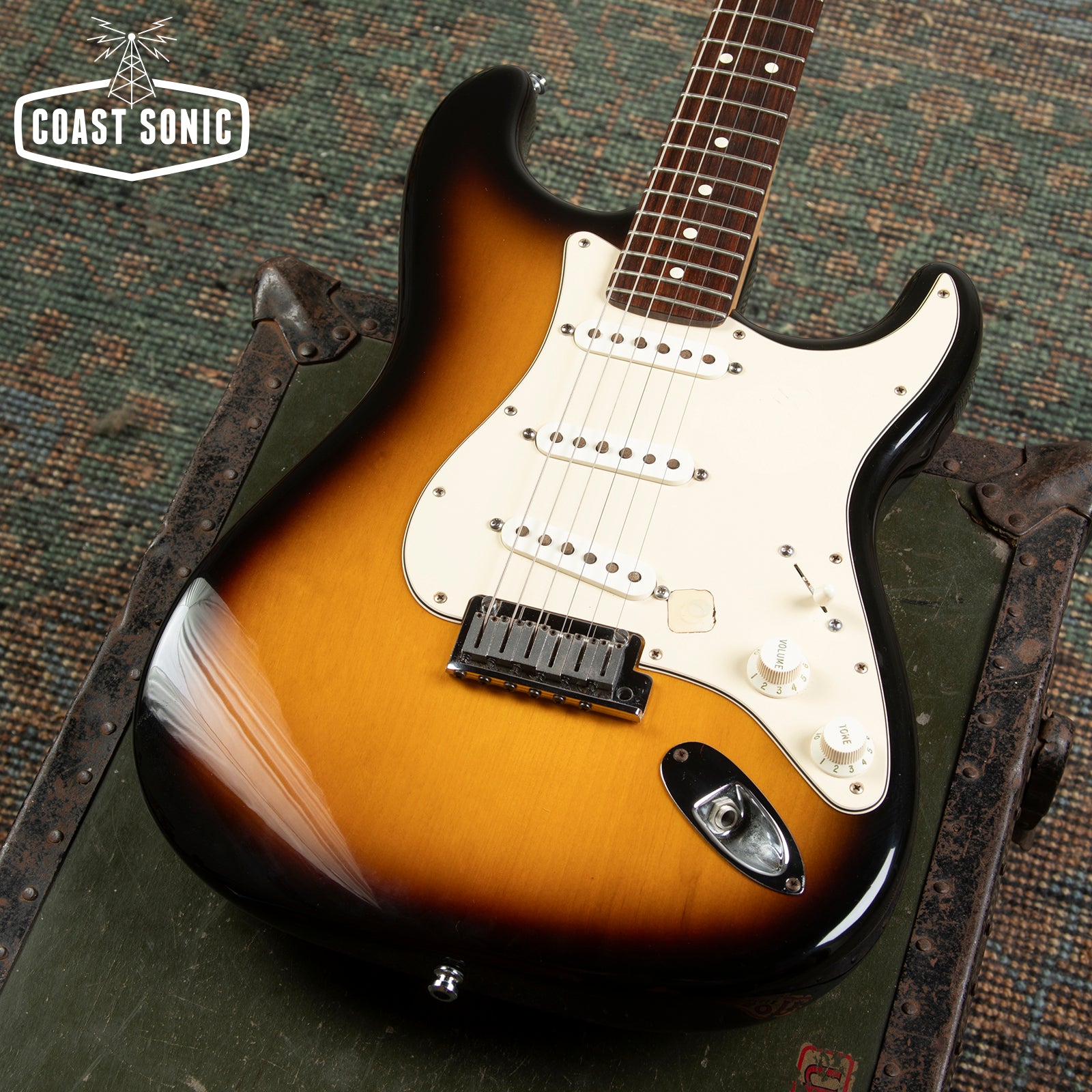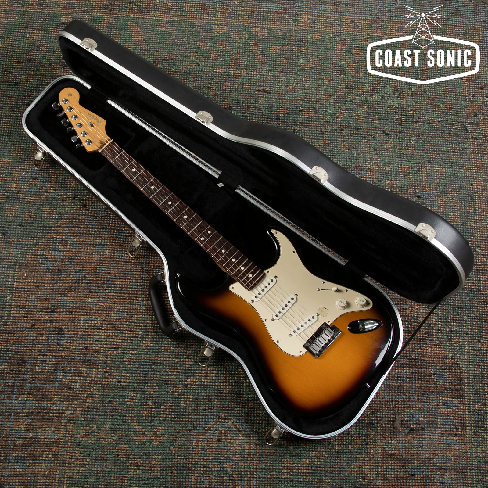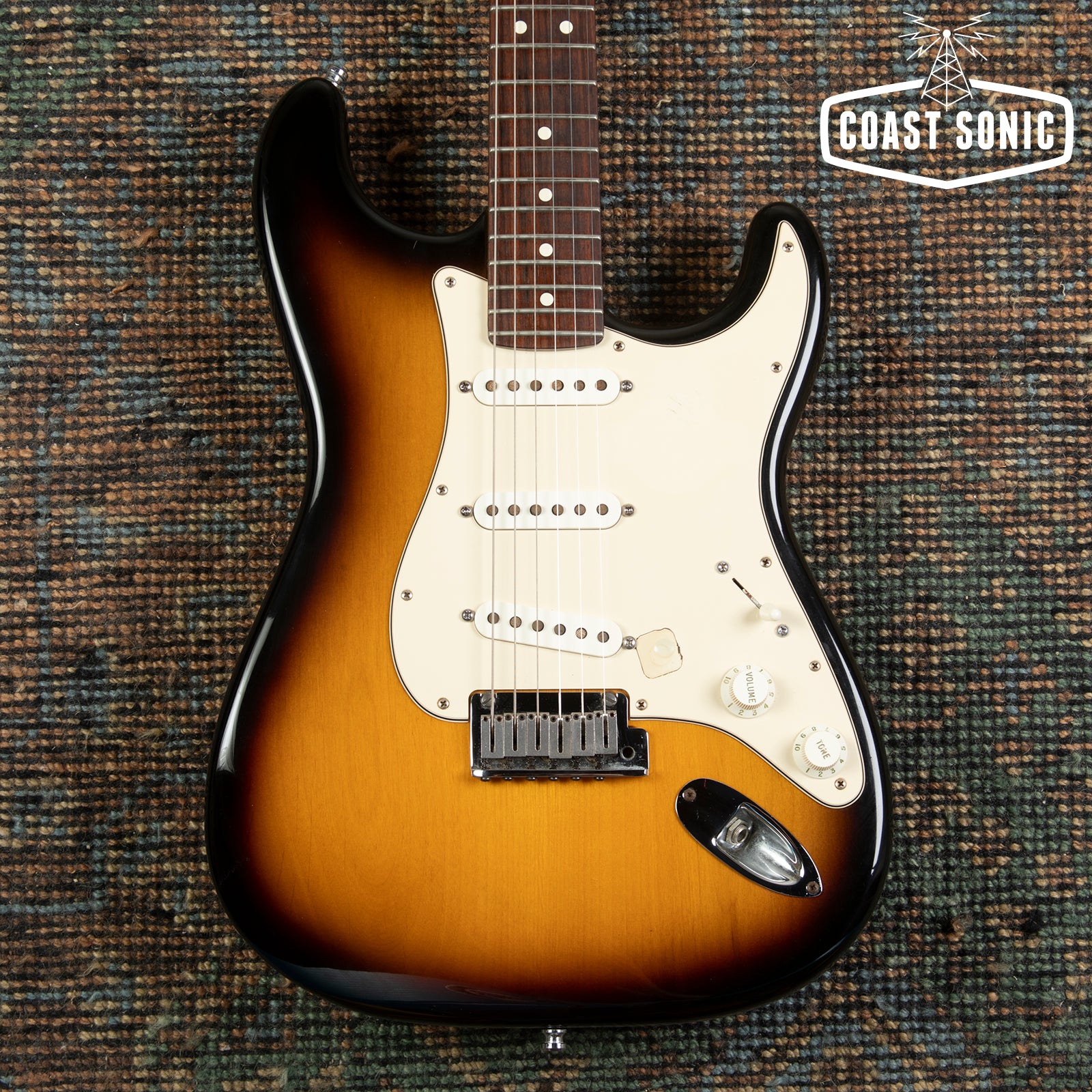Here for your consideration is a 2006 USA Fender 60th Anniversary Series Stratocaster in very good condition! This one has been modded to have one master tone control and one master volume. The top volume control has been moved to the middle position and the top hole has been covered. The body shows some minor surface marks/scratches but is otherwise very clean. Neck is in excellent condition and feels great. Headstock shows some very minor wear but is otherwise very clean. Fretboard is clean and frets show only light wear with no issues and plenty of life in them. bridge and saddles are clean but tuning machines show a fair amount of pitting but still work great. Electronics work great and feature the mod that we described with only one master volume and tone control. Perfect if you're the type of player who wants that top volume knob out of the way. Pickups sound great. Pickups sound fantastic and features a slightly hotter bridge for a nice balanced feel between pickups. Overall in great shape and one of the nicest feeling strats we have in the shop right now. Has been fully inspected and set up by our tech. Includes original hard case which includes the original volume pot and knob, and original paperwork.