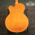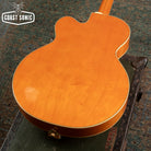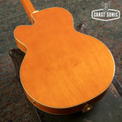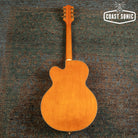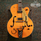 Designed for pure tone and slick, comfortable playing feel, this guitar features the classic appointments Gretsch fans desire - gold G-arrow control knobs, aged white binding with black purfling, durable gloss nitrocellulose lacquer finish, aged pearloid block inlays with classic Western motif, gold vintage thick plexi pickguard with Gretsch logo and gold Grover® Sta-Tite™ tuning machines. A resurrected blast from the past with elegantly refined style and sound, the G6120T-55 Vintage Select Edition '55 Chet Atkins® Hollow Body with Bigsby® is sure to satisfy any devotee of Gretsch's golden era.