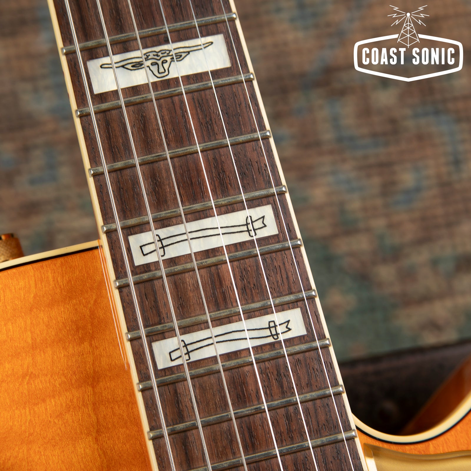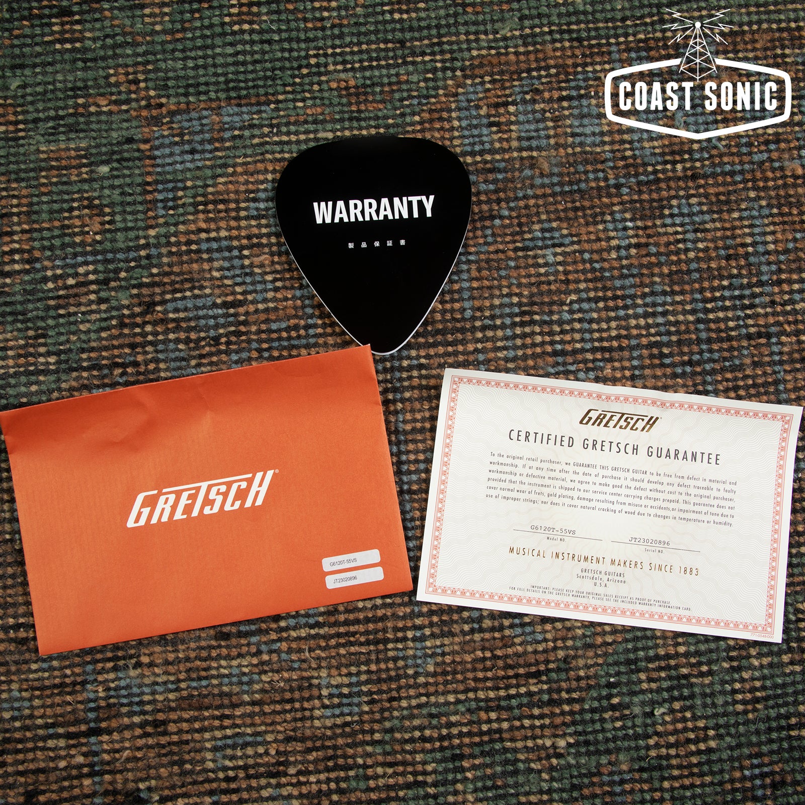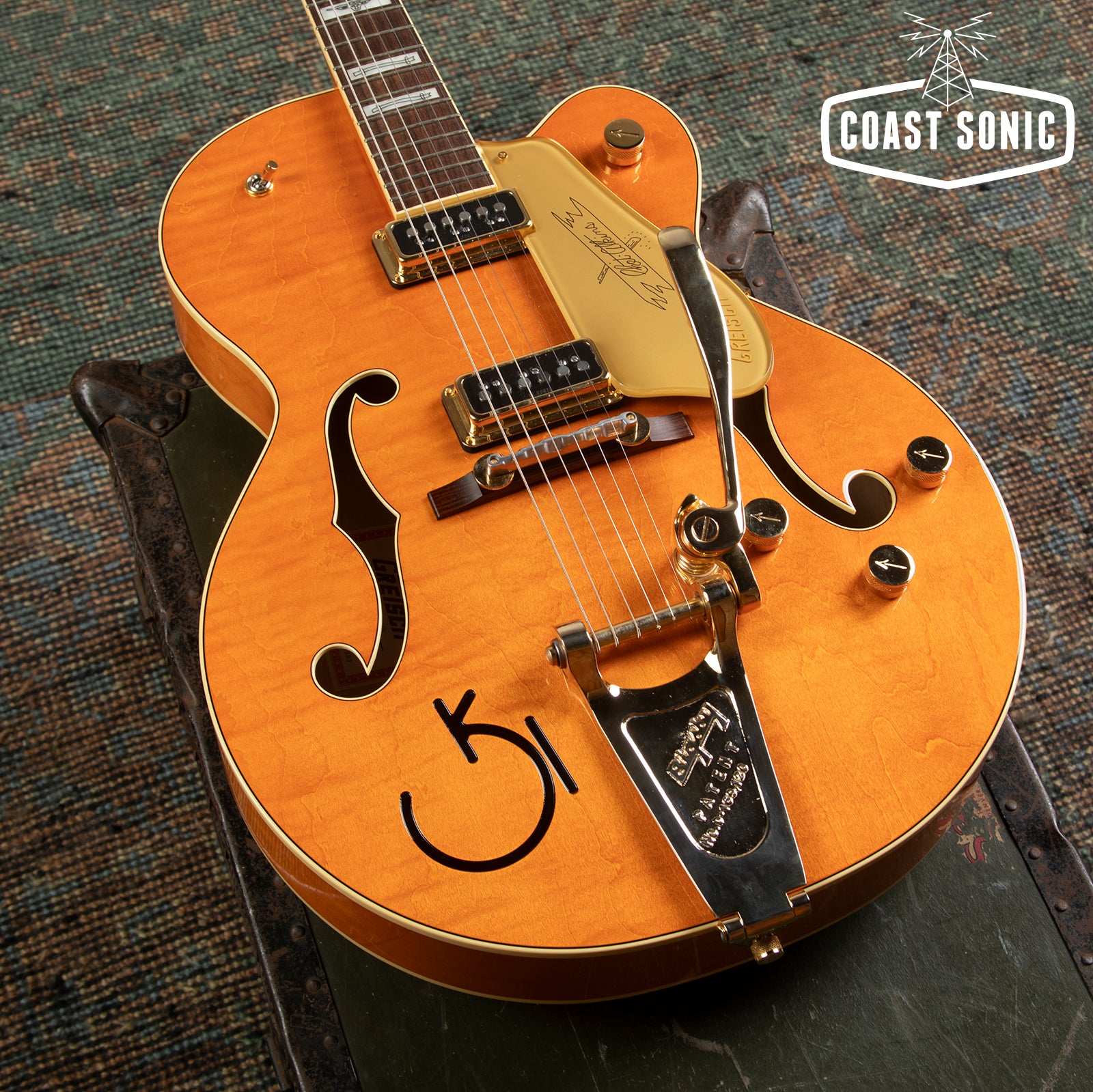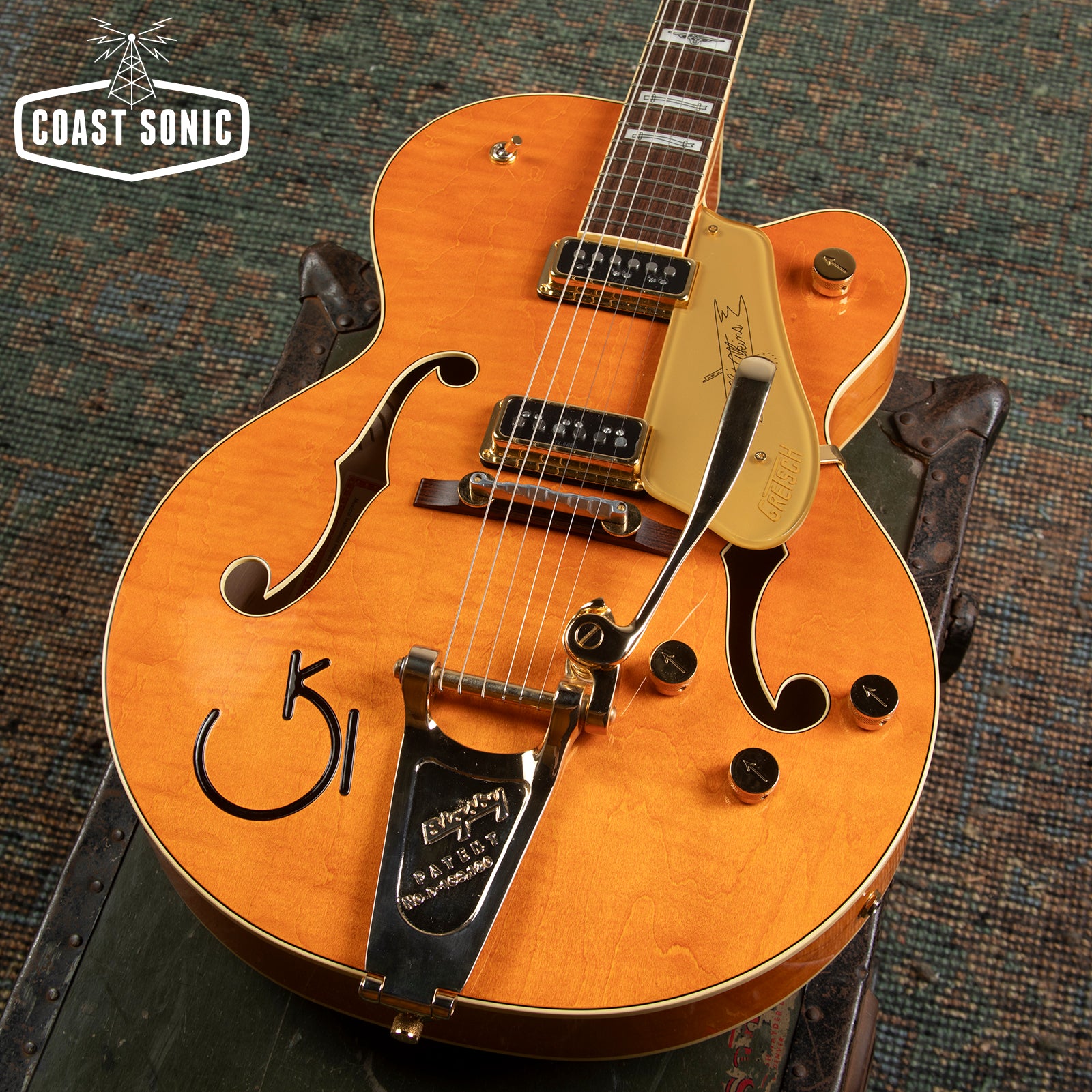 Here for your consideration is an absolutely stunning 2023 Gretsch '55 Chet Atkins G6120T-55 Vintage Select Edition w/ Bigsby! This one is in excellent, essentially mint condition. Beautiful "Vintage Orange Stain" Nitro finish complete with gold hardware and "Western" inlays. Featuring T.V Jones Dynastic "T-Armond" pickups that sound incredible. This is in our opinion the pinnacle Gretsch! Looks incredible and plays incredible as well. Has been fully inspected and set up by our tech who is a Gretsch fanatic. Includes Gretsch hard case with original documentation. Check below for specs and a full description from Gretsch.