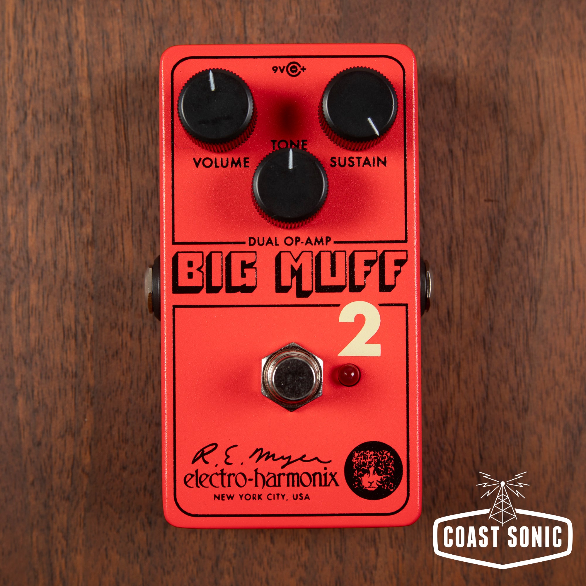 Featuring the familiar control set of Volume, Tone, and Sustain, the Big Muff Pi 2 comes in a nano sized die-cast chassis with art designed by EHX aficionado, Daniel Danger. SUSTAIN controls the amount of sustain and distortion from medium grit to full fuzz fury. TONE adjusts the tone from brash rasp to deep thunder, increasing treble and decreasing bass as it’s turned up. VOL sets the overall output of the pedal.