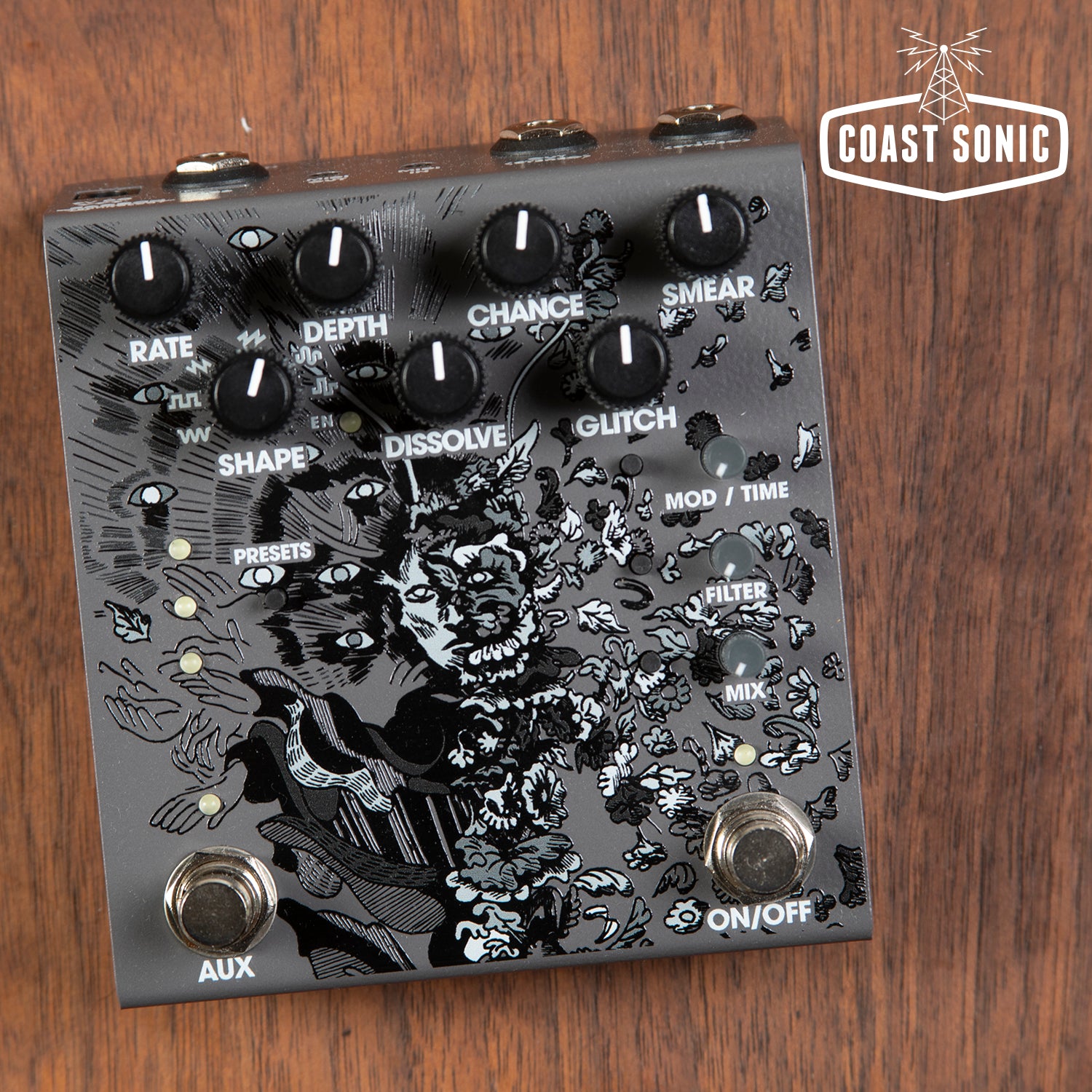 • Tactile switches to set modulation type (tremolo or vibrato), filter type (low pass or high pass), and mix type (standard or modified)